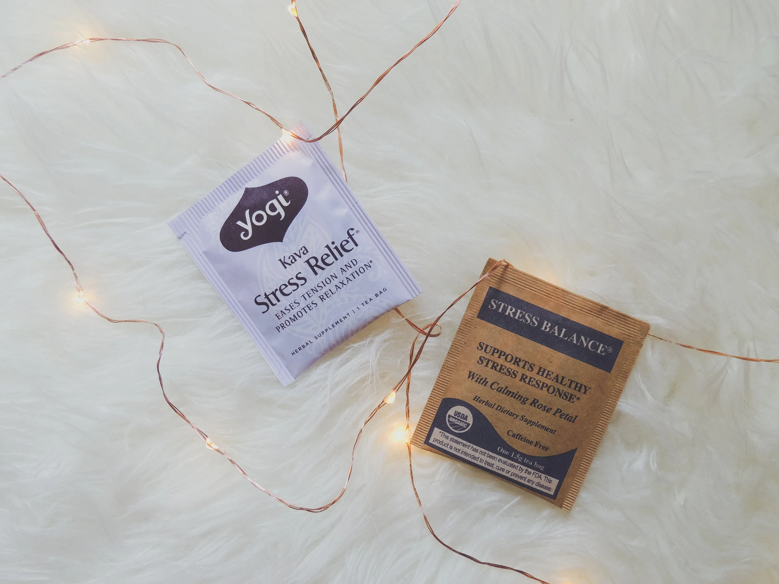 These are the two kinds of tea I've been using recently. Yogi Kava Stress Relief, and Stress Balance from Life Awareness.